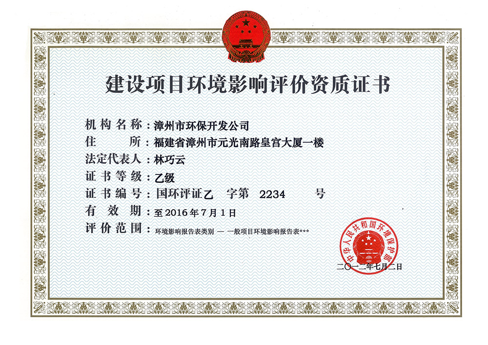 • 建設項目環境影響評價資質證書